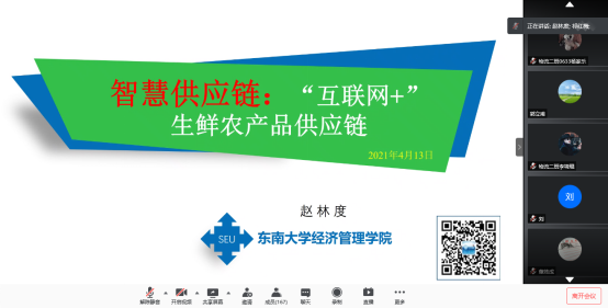 2021年4月13日,应公司和科研处邀请,赵林度教授在腾讯会议平台做题目为“智慧供应链:‘互联网+’生鲜农产品供应链”学术讲座,讲座由祁红梅经理主持,公司全体教师、研究生以及智慧物流班本科生等共180余人聆听了此次讲座。