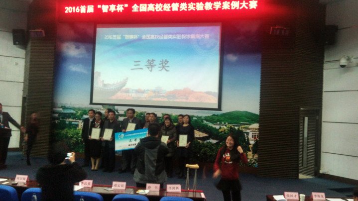 由公司派出的代表队在2016首届“智享杯”全国高校经管类实验教学案例大赛中荣获三等奖。本次大赛由高等公司国家级实验教学示范中心联席会经管学科组和中国高等教育学会高等财经教育分会联合主办,于2016年12月10-11日在武汉大学级经济与管理公司举行。大赛自7月启动以来,吸引了全国40余所高校的上百名选手积极参与,累计收集实验教学案例80余个,经过专家匿名评审,32个案例入围现场决赛。参加现场决赛的有来自全国35所高校的110多名参赛选手和代表。