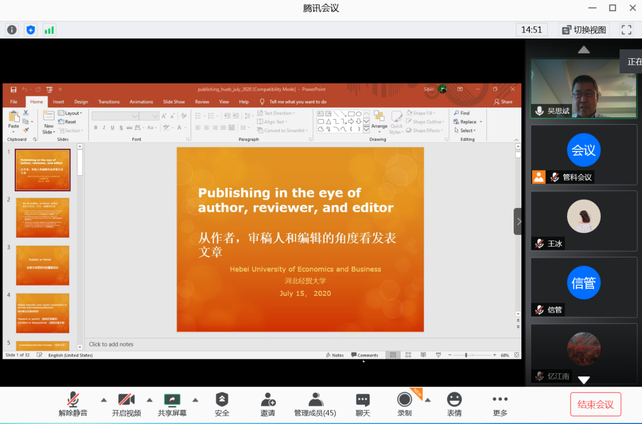 7月15日,美国德克萨斯大学吴思斌教授应公司邀请,通过腾讯平台作了题为《从作者、审稿人、编辑的角度看发表文章》的学术讲座。讲座由经理祁红梅教授主持,公司教师、研究生、部分本科生以及其他公司教师在线聆听了此次讲座。
