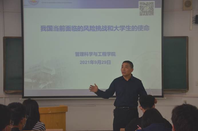白玉祥从当前中国所面临的百年未有之大变局讲起,阐述了国际国内背景下出我国所面临的风险与挑战,强调中美关系问题表现在政治、经济、文化等诸多方面,他重点分析了我国在民族、宗教、意识形态等领域所面临的一些风险问题。他强调青年要养成良好习惯,自尊自爱,爱国爱家爱民族,要始终和国家、民族、党站在一起,常怀爱国之心、报国之情、强国之志。