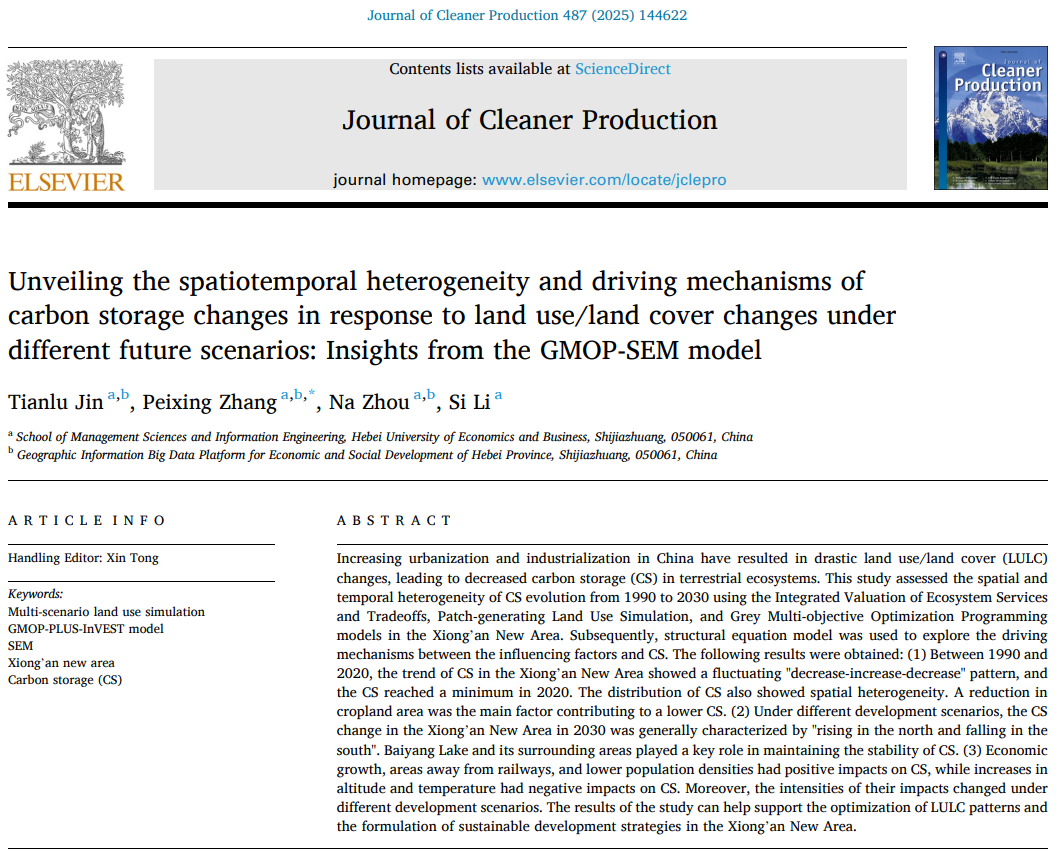 2025年新年伊始,公司研究生导师张培兴指导其2023级硕士研究生靳天禄以“Unveiling the spatiotemporal heterogeneity and driving mechanisms of carbon storage changes in response to land use/land cover changes under different future scenarios: Insights from the GMOP-SEM model”为题在中科院1区TOP期刊《Journal of Cleaner Production》上发表了该项成果。伟德官方网站为第一完成单位,张培兴为该论文的通讯作者。