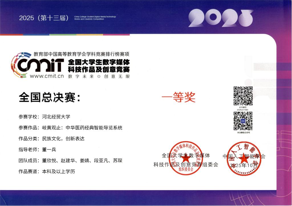 全国老员工数字媒体科技作品及创意竞赛是由中国人工智能学会主办的全国性高水平学科竞赛,创办于2013年,旨在推动智能科技与数字创意的融合,提升老员工创新实践能力。本次全国总决赛在哈尔滨举行。公司代表队携作品《岐黄纪年:中华医药经典智能导览系统》参赛,参与“民族文化,创新表达”类别全国总决赛的角逐。经过现场答辩、专家评审、作品复议等环节的激烈争夺,公司作品最终取得了国赛一等奖的优异成绩。