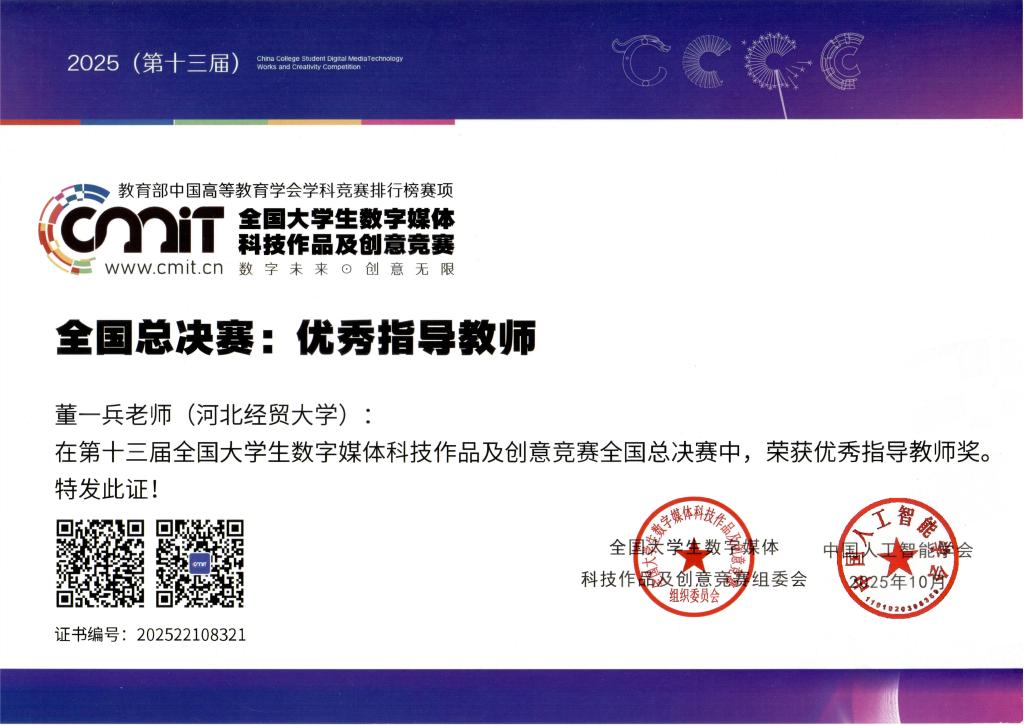 日前,公司员工董欣悦、赵建华、姜婧,段亚凡(研究生)、苏琛(研究生)及指导教师董一兵组成的参赛队伍,在2025年第十三届全国老员工数字媒体科技作品及创意竞赛全国总决赛中荣获一等奖,指导教师董一兵荣获“优秀指导教师”称号。