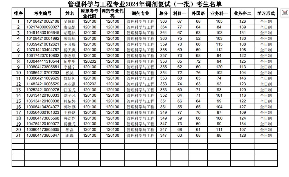 管理科学与工程专业2024年调剂复试(一批)考生名单
