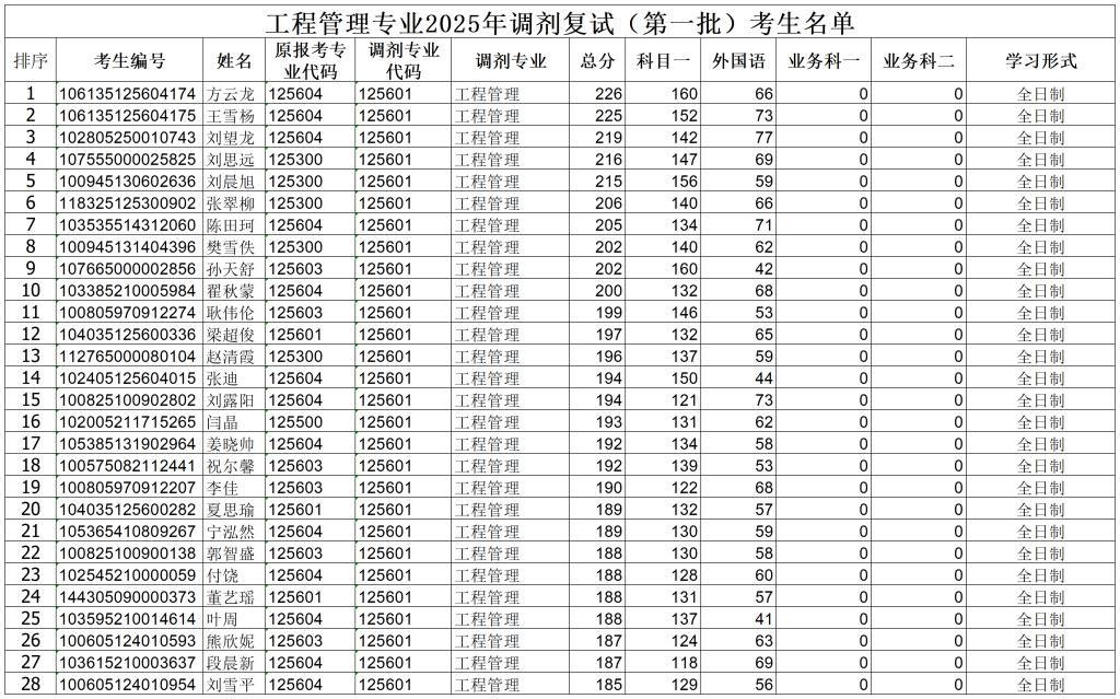 管理科学与工程专业2025调剂复试(第一批)考生名单