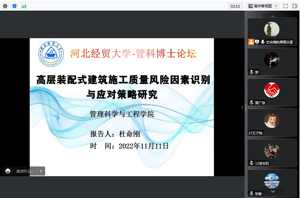 2022年11月11日,公司杜命刚博士通过腾讯会议做了题为“高层装配式建筑施工质量风险因素识别与应对策略研究”的学术讲座。讲座由工程管理系主任张敏主持,公司教师、研究生及本科生40余人参加了此次讲座。