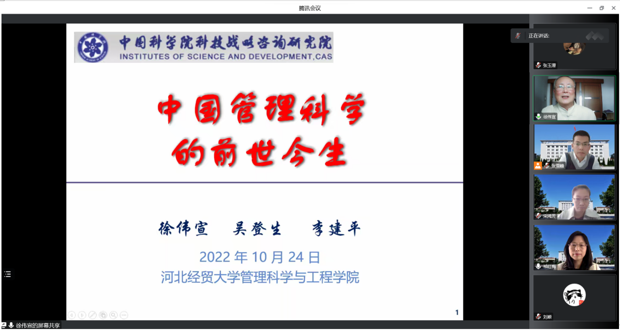10月24日下午,公司有幸邀请到中国科公司政策所原所长、中国优选法统筹法与经济数学研究会理事长徐伟宣研究员作了题为“中国管理科学的前世今生”的线上学术讲座。讲座由公司经理祁红梅教授主持,公司师生及中科院等院校相关领域学者400余人通过线上线下结合的方式一同参加了本次讲座。