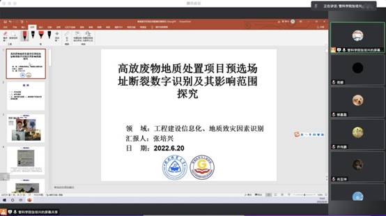2022年6月20日,公司张培兴博士通过腾讯平台做了题为“高放废物地质处置项目预选场址断裂数字识别及其影响范围探究”的学术讲座。讲座由周娜博士主持,公司教师及工程管理专业研究生参加了此次讲座。