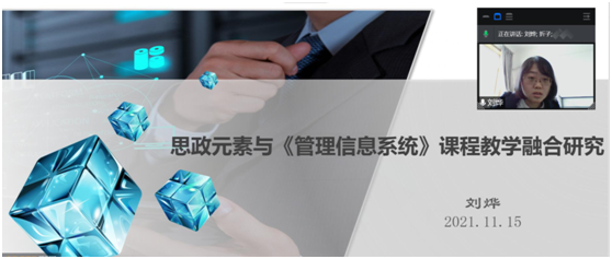 2021年11月15日,由教学评估与教师教学发展中心主办,公司承办的本年度第91期教学沙龙活动顺利举行。刘烨老师应邀做“思政元素与管理信息系统课程教学融合研究”交流分享。100余名院内外教师参加。