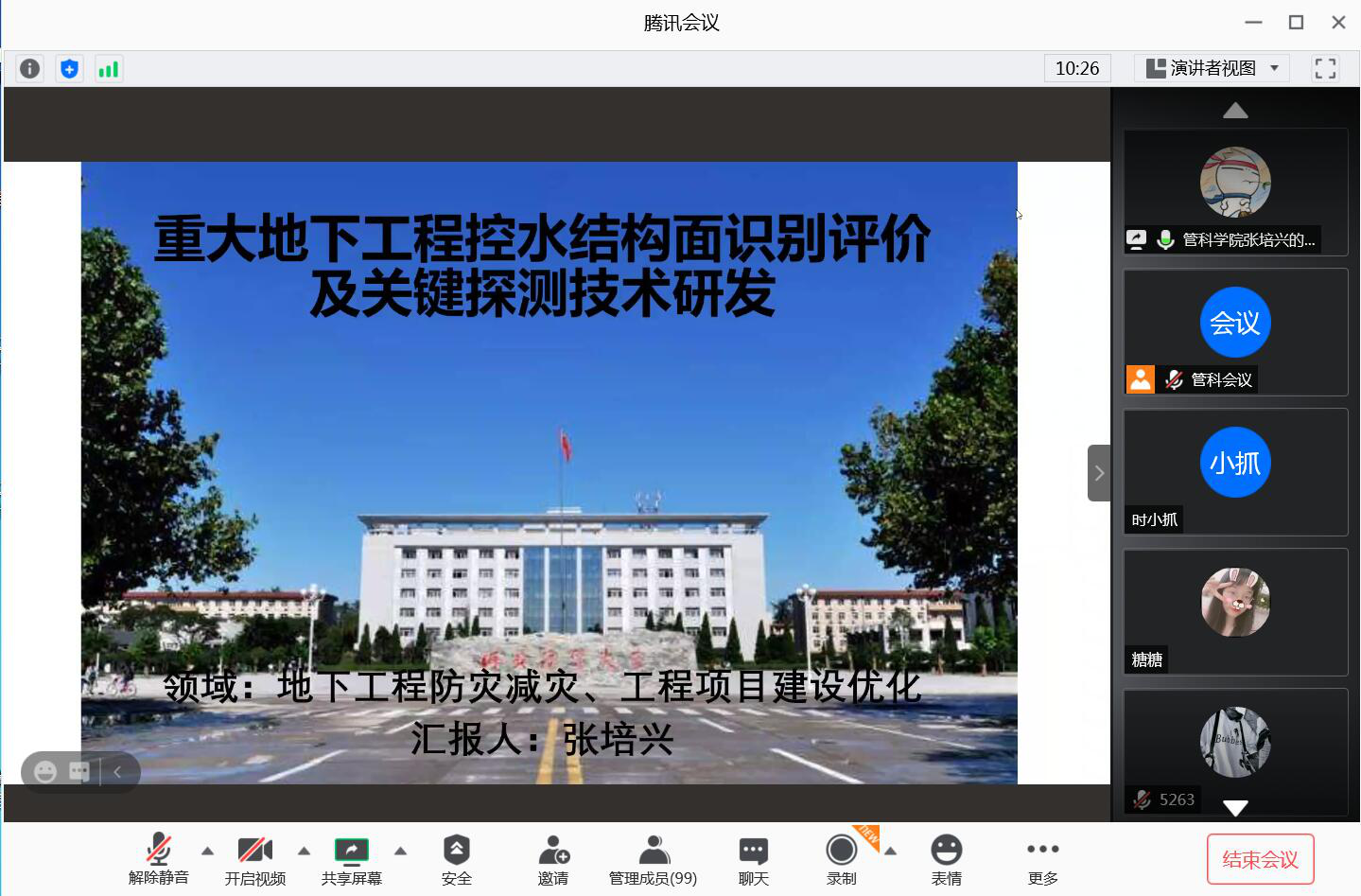 10月5日,公司张培兴博士在腾讯平台开展“重大地下工程控水结构面识别评价及关键探测技术研发”学术讲座。讲座由导师组组长宋鸿芳主持,管理科学与工程公司教师、研究生以及部分本科生在线参加了此次讲座。