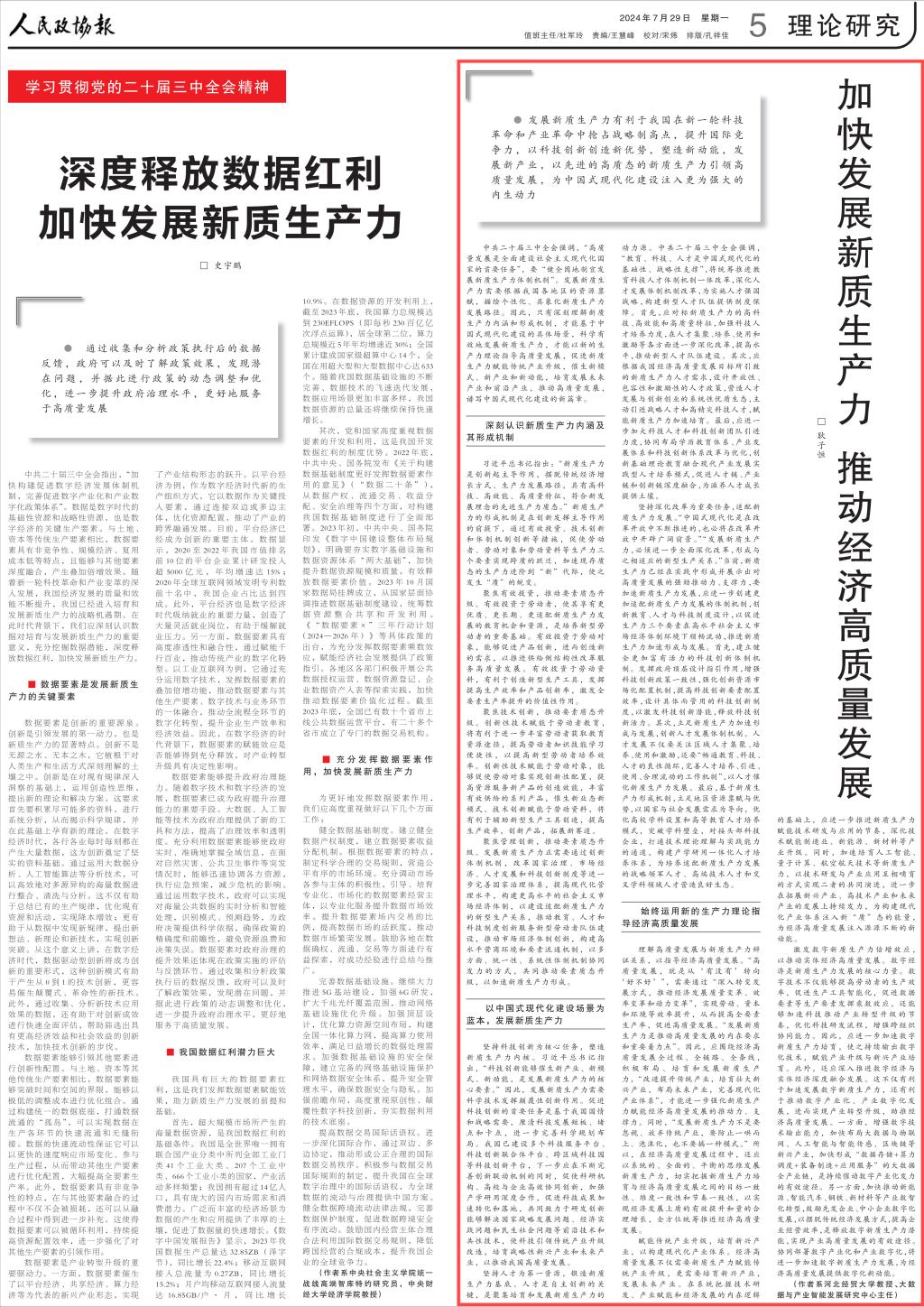 2024年07月29日,《人民政协报》第5版(理论研究版)刊发公司bevictor伟德耿子恒教授的“学习贯彻党的二十届三中全会精神”专题署名文章《加快发展新质生产力推动经济高质量发展》。