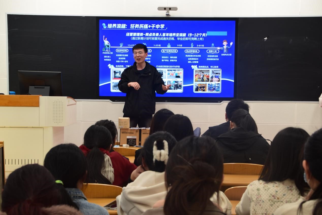 顺丰HR通过讲解PPT的方式,主要围绕企业的发展历程、招聘岗位、福利待遇及业绩展示四个方面对顺丰集团进行了详细介绍。公司优秀学长分享了企业工作的经验和心得,并解答了同学们关心的职业发展和薪资待遇等问题,为在校生提供了宝贵的职场经验参考,帮助他们更好地了解顺丰集团的工作环境和职业发展前景。最后,企业主讲人重点介绍了如何加入顺丰集团,包括招聘流程、条件要求等内容,为有意加入顺丰的同学提供了解和申请的渠道。